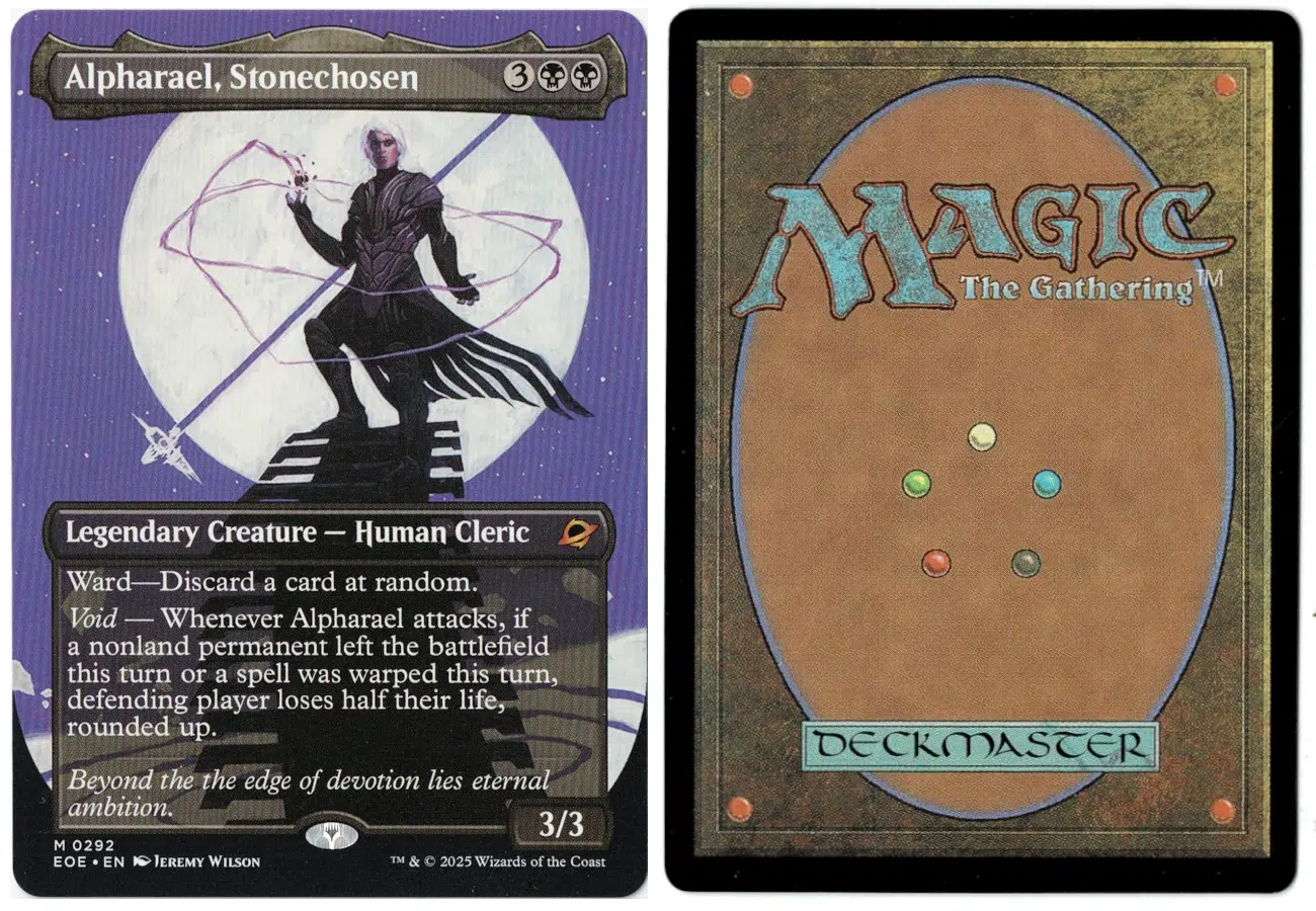 Void — Whenever Alpharael attacks, if a nonland permanent left the battlefield this turn or a spell was warped this turn, defending player loses half their life, rounded up.