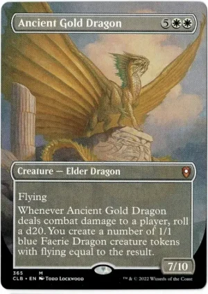 Whenever Ancient Gold Dragon deals combat damage to a player, roll a d20. You create a number of 1/1 blue Faerie Dragon creature tokens with flying equal to the resault.