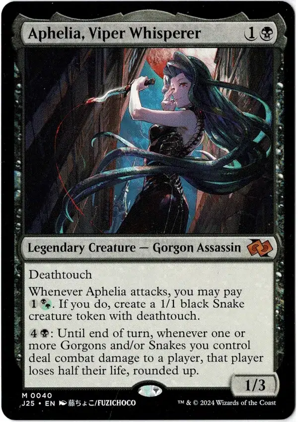 Whenever Aphelia attacks, you may pay 1(B/G). If you do, create a 1/1 black Snake creature token with deathtouch.