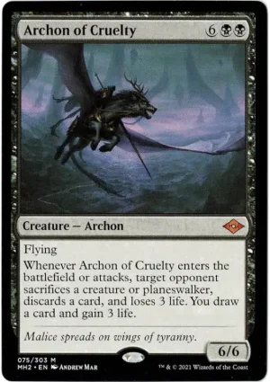 Whenever Archon of Cruelty enters the battlefield or attacks, target opponent sacrifices a creature or planeswalker, discards a card, and loses 3 life. You draw a card and gain 3 life.