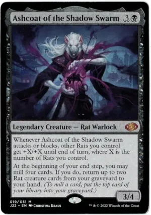 Whenever Ashcoat of the Shadow Swarm attacks or blocks, other Rats you control get +X+X until end of turn, where X is the number of Rats you control.