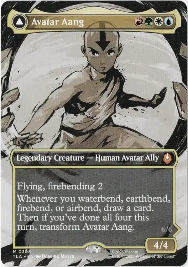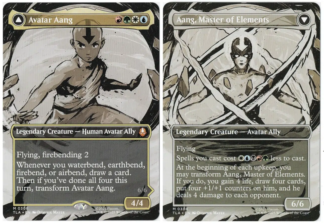 Whenever you waterbend, earthbend, firebend, or airbend, draw a card. Then if you’ve done all four this turn, transform Avatar Aang.