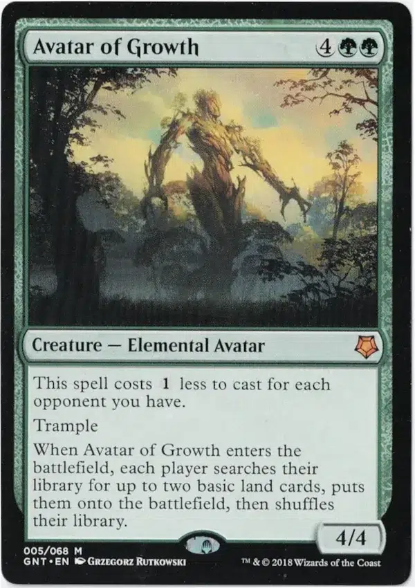 This spell costs 1 less to cast for each opponent you have. Trample When Avatar of Growth enters the battlefield, each player searches their library for up to two basic land cards, puts them onto the battlefield, then shuffles their library.