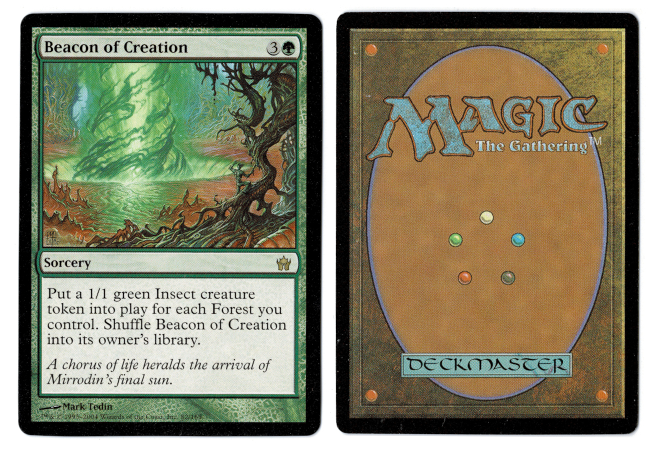Put a 1/1 green Insect creature token into play for each Forest you control. Shuffle Beacon of Creation into its owner’s library.