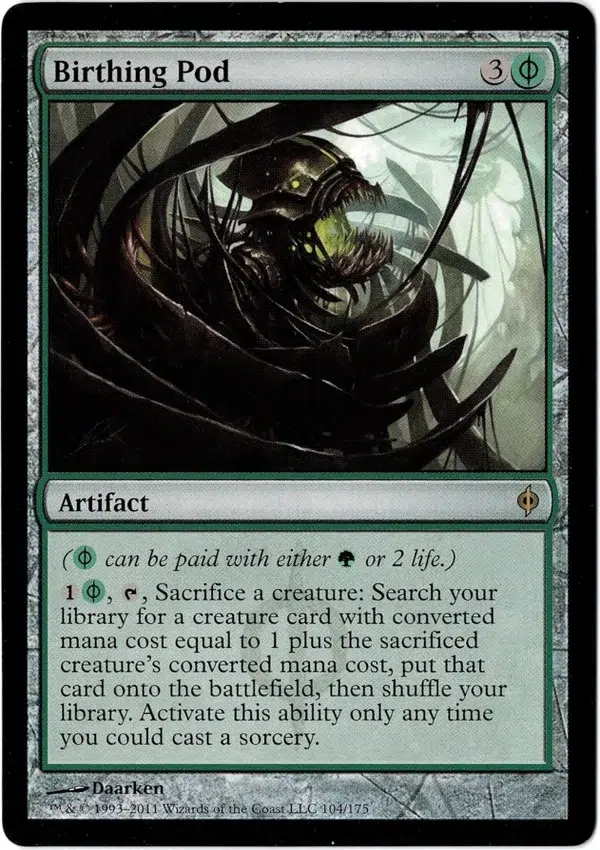 1(G/P), T, Sacrifice a creature: Search your library for a creature card with converted mana cost equal to 1 plus the sacrificed creature’s converted mana cost, put that card onto the battlefield, then shuffle your library. Activate this ability only any time you could cast a sorcery.