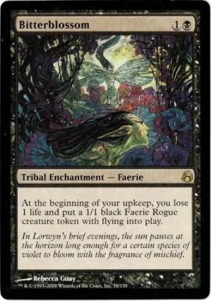 At the beginning of your upkeep, you lose 1 life and put a 1/1 black Faerie Rogue creature token with flying into play.