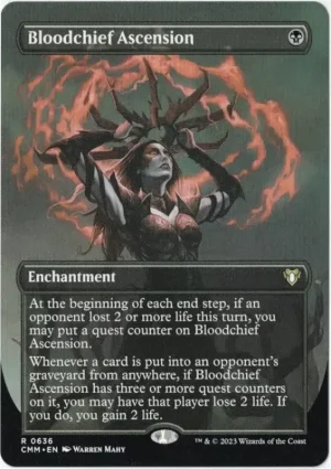 Whenever a card is put into an opponent’s graveyard from anywhere, if Bloodchief Ascension has three or more quest counters on it, you may have that player lose 2 life. If you do, you gain 2 life.