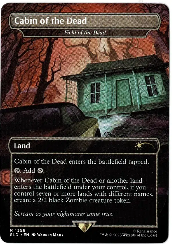 Whenever Cabin of the Dead or another land enters the battlefield under your control, if you control seven or more lands with different names, create a 2/2 black Zombie creature token.