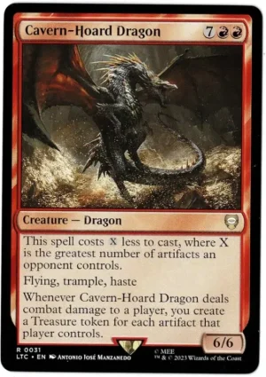 Whenever Cavern-Hoard Dragon deals combat damage to a player, you create a Treasure token for each artifact that player controls.