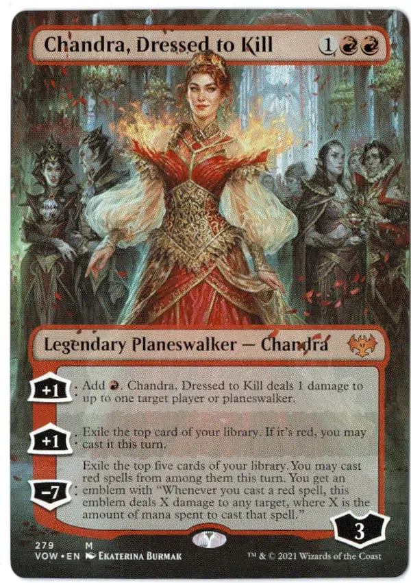 [-7]: Exile the top five cards of your library. You may cast red spells from among them this turn. You get an emblem with “Whenever you cast a red spell, this emblem deals X damage to any target, where X is the amount of mana spent to cast that spell.”
