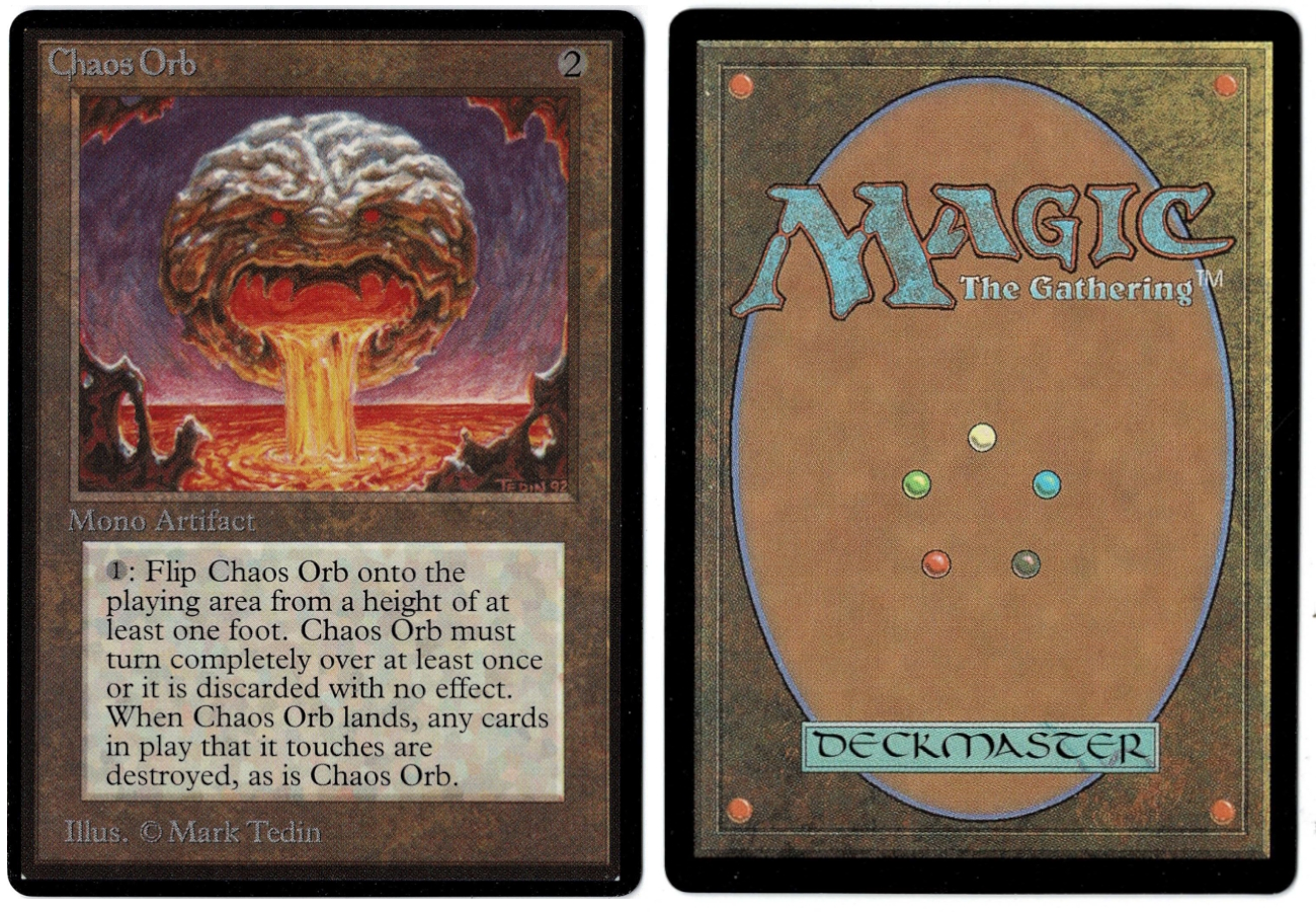 1: Flip Chaos Orb onto the playing area from a height of at least one foot. Chaos Orb must turn completely over at least once or it is discarded with no effect. When Chaos Orb lands, any cards in play that it touches are destroyed, as is Chaos Orb.