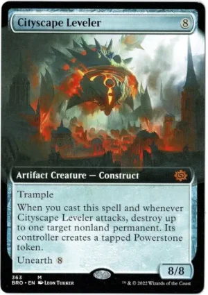 When you cast this spell and whenever Cityscape Leveler attacks, destroy up to one target nonland permanent. Its controller creates a tapped Powerstone token.