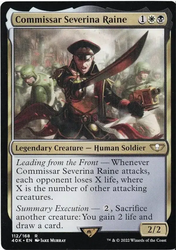 Leading from the Front — Whenever Commissar Severina Raine attacks, each opponent loses X life, where X is the number of other attacking creatures.