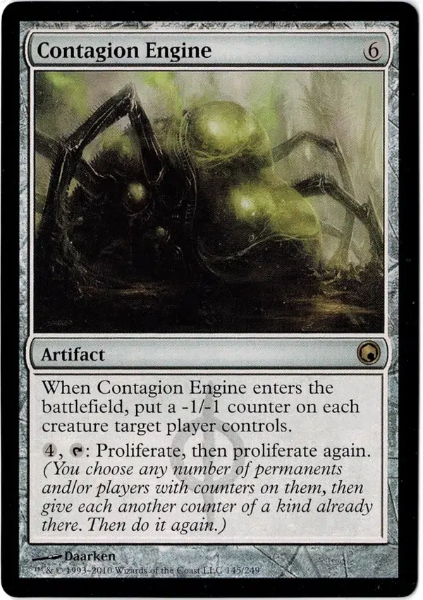 When Contagion Engine enters the battlefield, put a -1/-1 counter on each creature target player controls.