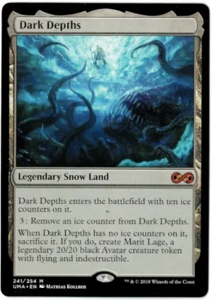 When Dark Depths has no ice counters on it, sacrifice it. If you do, create Marit Lage, a legendary 20/20 black Avatar creature token with flying and indestructible.