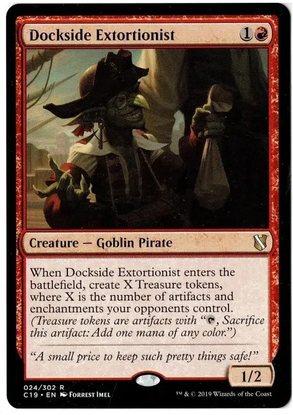 When Dockside Extortionist enters the battlefield, create X Treasure tokens, where X is the number of artifacts and enchantments your opponents control.