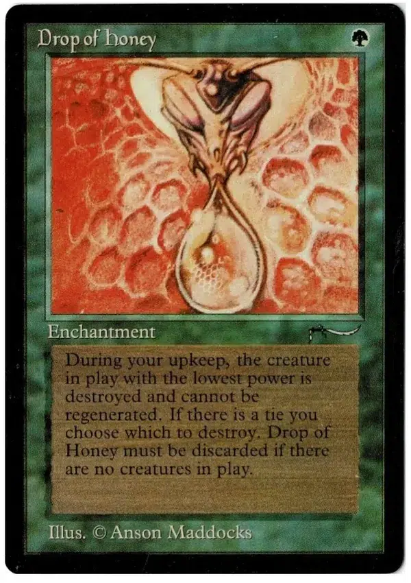 During your upkeep, the creature in play with the lowest power is destroyed and cannot be regenerated. If there is a tie you choose which to destroy. Drop of Honey must be discarded if there are no creatures in play.