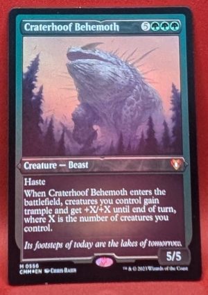 When Craterhoof Behemoth enters the battlefield, creatures you control gain trample and get +X/+X until end of turn, where X is the number of creatures you control.