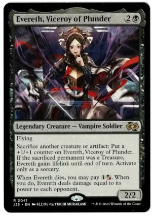Sacrifice another creature or artifact: Put a +1/+1 counter on Evereth, Viceroy of Plunder. If the sacrificed permanent was a Treasure, Evereth gains lifelink until end of turn. Activate only as a sorcery.