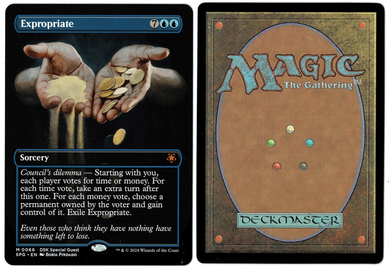Council’s Dilemma — Starting with you, each player votes for time or money. For each time vote, take an extra turn after this one. For each money vote, choose a permanent owned by the voter and gain control of it. Exile Expropriate.