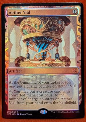 T: You may put a creature card with converted mana cost equal to the number of charge counters on Aether Vial from your hand onto the battlefield.