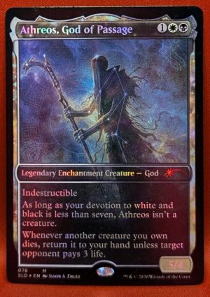As long as your devotion to white and black is less than seven, Athreos isn’t a creature.
