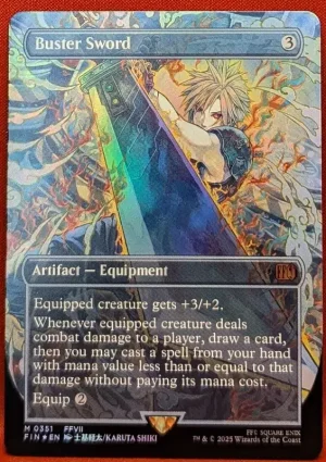 Equipped creature gets +3/+2. Whenever equipped creature deals combat damage to a player, draw a card, then you may cast a spell from your hand with mana value less than or equal to that. damage without paying its mana cost. Equip 2- Rarity: M