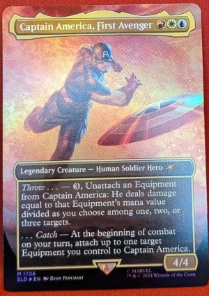 … Catch — At the beginning of combat on your turn, attach up to one target Equipment you control to Captain America.