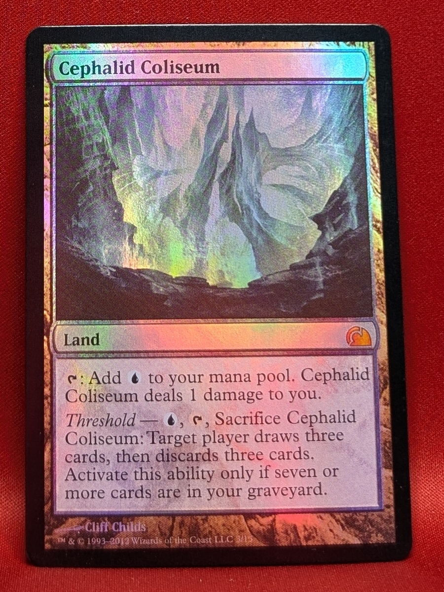Tap: Add U to your mana pool. Cephalid Coliseum deals 1 damage to you. Threshold – U, Tap, Sacifice Cephalid Coliseum: Target player draws three cards, then discards three cards from his or her hand. (Play this ability only if seven or more cards are in your graveyard.)