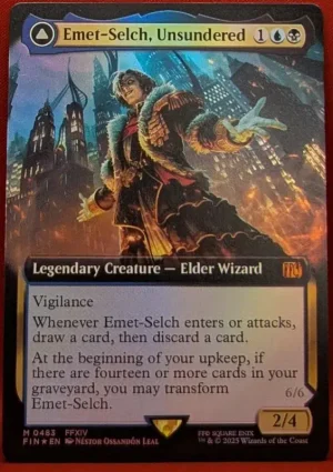 At the beginning of your upkeep, if there are fourteen or more cards in your graveyard, you may transform Emet-Selch.