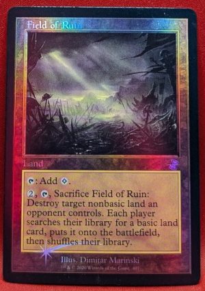 2, T, Sacrifice Field of Ruin: Destroy target nonbasic land an opponent controls. Each player searches his or her library for a basic land card, puts it onto the battlefield, then shuffles his or her library.