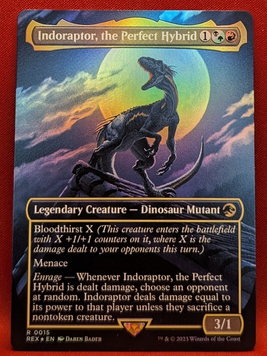 Enrage — Whenever Indoraptor, the Perfect Hybrid is dealt damage, choose an opponent at random. Indoraptor deals damage equal to its power to that player unless they sacrifice a nontoken creature.