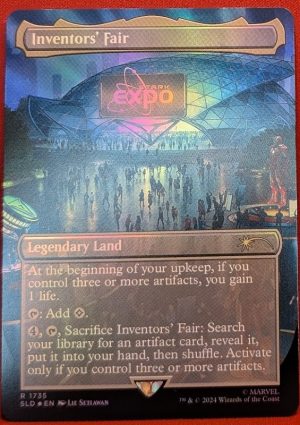 4, T, Sacrifice Inventors’ Fair: Search your library for an artifact card, reveal it, put it into your hand, then shuffle your library. Activate this ability only if you control three or more artifacts.
