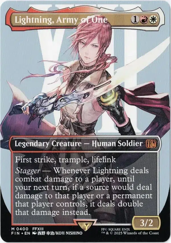 Stagger — Whenever Lightning deals combat damager to a player, until your next turn, if a source would deal damage to that player or a permanent that player controls, it deals double that damage instead.