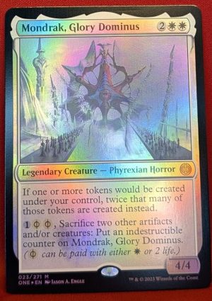 If one or more tokens would be created under your control, twice that many of those tokens are created instead. 1 WPWP, Sacrifice two other artifacts and/or creatures: Put an indestructible counter on Mondrak, Glory Dominus. (WP can be paid with either W or 2 life.)
