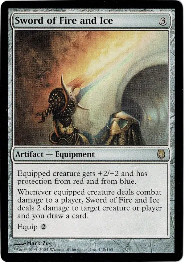 Whenever equipped creature deals combat damage to a player, Sword of Fire and Ice deals 2 damage to target creature or player and you draw a card.