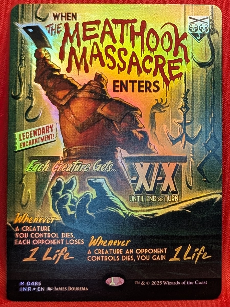 When The Meathook Massacre enters, each creature gets -X/-X until end of turn.