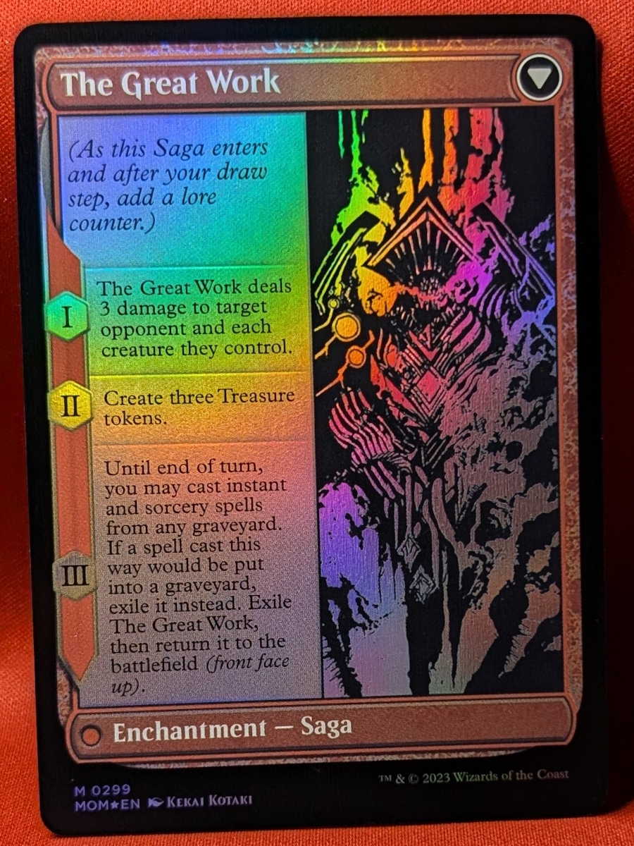 [III] Until end of turn, you may cast instant and sorcery spells from any graveyard. If a spell cast this way would be put into a graveyard, exile it instead. Exile The Great Work, then return it to the battlefield (front face up).