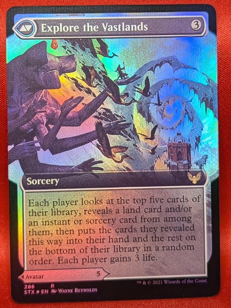 Whenever an opponent casts an instant or sorcery spell, they may pay 2. If they don’t, you may copy that spell. You may choose new targets for the copy. Explore the Vastlands