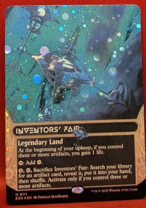 4, T, Sacrifice Inventors’ Fair: Search your library for an artifact card, reveal it, put it into your hand, then shuffle. Activate only if you control three or more artifacts.