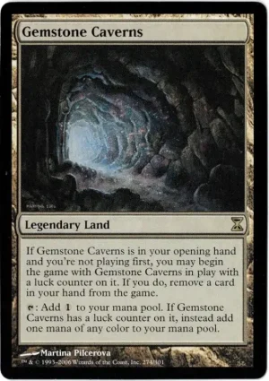 If Gemstone Caverns is in your opening hand and you’re not playing first, you may begin the game with Gemstone Caverns in play with a luck counter on it. If you do, remove a card in your hand from the game. T Add 1 to your mana pool. If Gemstone Caverns has a luck counter on it, instead add one mana of any color to your mana pool.