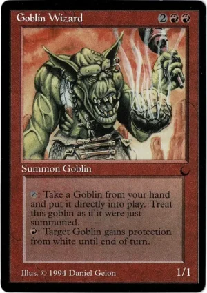 T: Take a Goblin from your hand and put it directly into play. Treat this goblin as if it were just summoned.R: Target Goblin gains protection from white until end of turn.