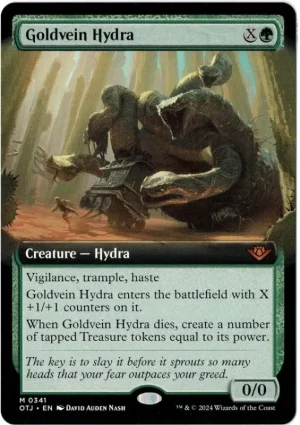 When Goldvein Hydra dies, create a number of tapped Treasure tokens equal to its power.