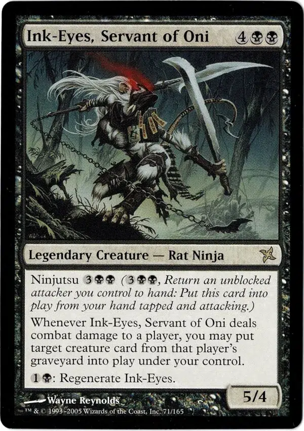 Ninjutsu 3BB (3BB, Return an unblocked attacker you control to hand: Put this card into play from your hand tapped and attacking.) Whenever Ink-Eyes, Servant of Oni deals combat damage to a player, you may put target creature card from that player’s graveyard into play under your control. 1B: Regenerate Ink-Eyes.