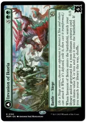 When Invasion of Ikoria enters the battlefield, search your library and/or graveyard for a non-Human creature card with mana value X or less and put it onto the battlefield. If you search your library this way, shuffle.