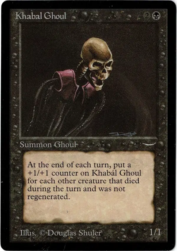 At the end of each turn, put a +1/+1 counter on Khabál Ghoul for each other creature that died during the turn and was not regenerated.