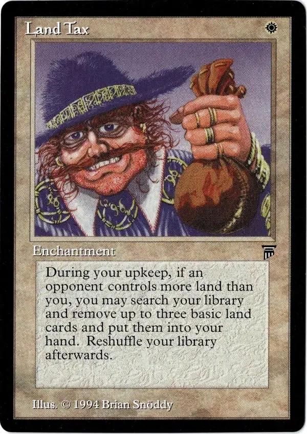 During your upkeep, if an opponent controls more land than you, you may search your library and remove up to three basic land cards and put them into your hand. Reshuffle your library afterwards.
