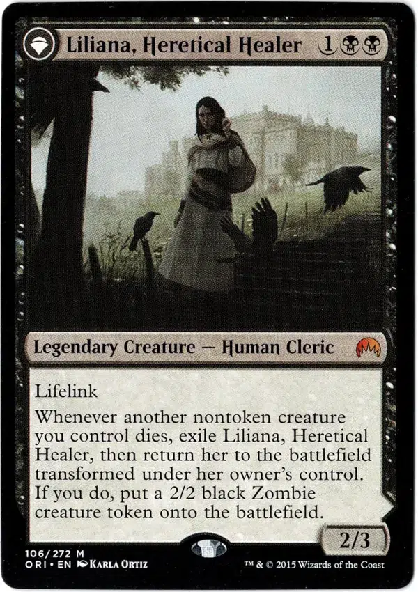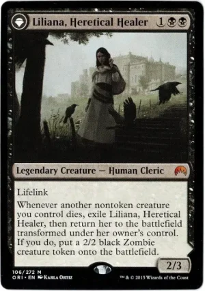 Whenever another nontoken creature you control dies, exile Liliana, Heretical Healer, then return her to the battlefield transformed under her owner’s control. If you do, put a 2/2 black Zombie creature token onto the battlefield.