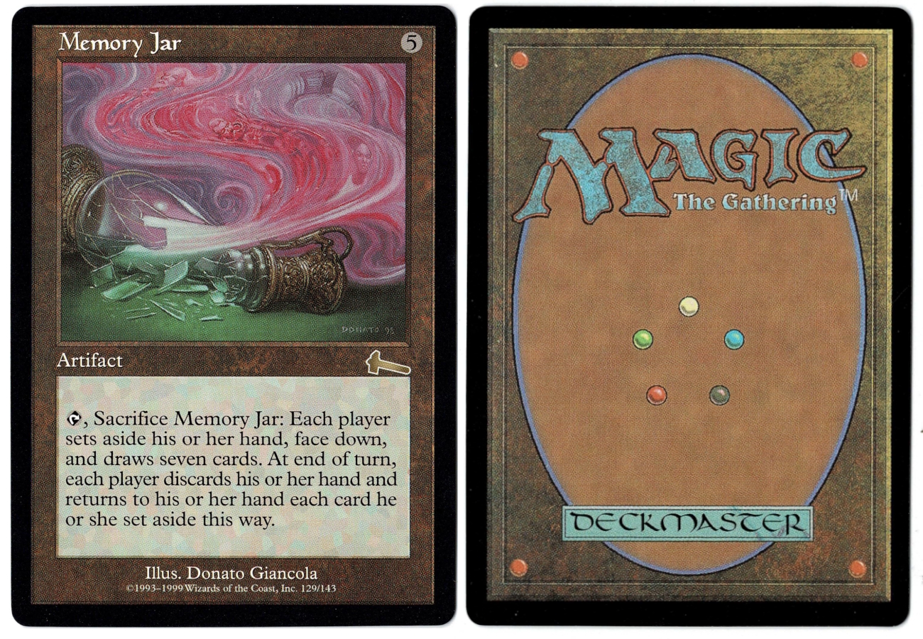 tap, Sacrifice Memory Jar: Each player sets aside his or her hand, face down, and draws seven cards. At end of turn, each player discards his or her hand and returns to his or her hand each card he or she set aside this way.
