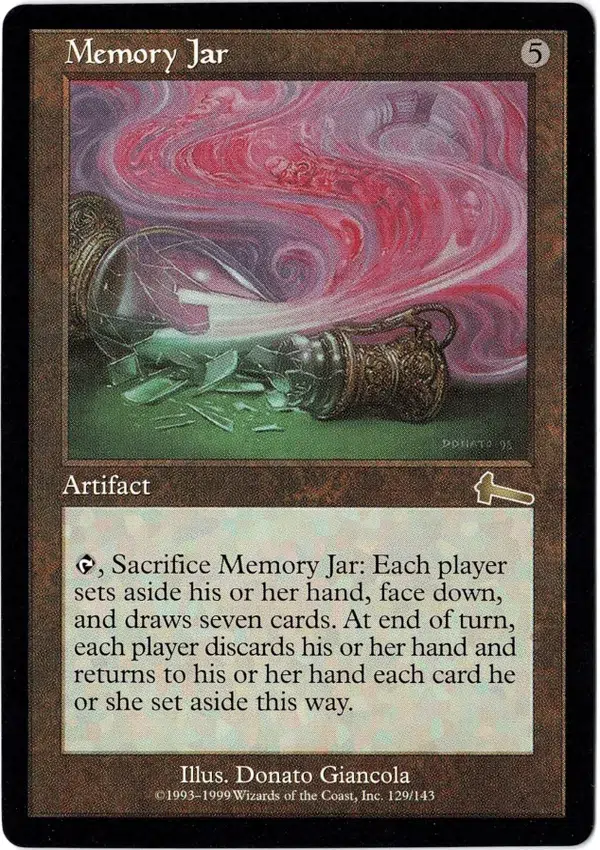 tap, Sacrifice Memory Jar: Each player sets aside his or her hand, face down, and draws seven cards. At end of turn, each player discards his or her hand and returns to his or her hand each card he or she set aside this way.